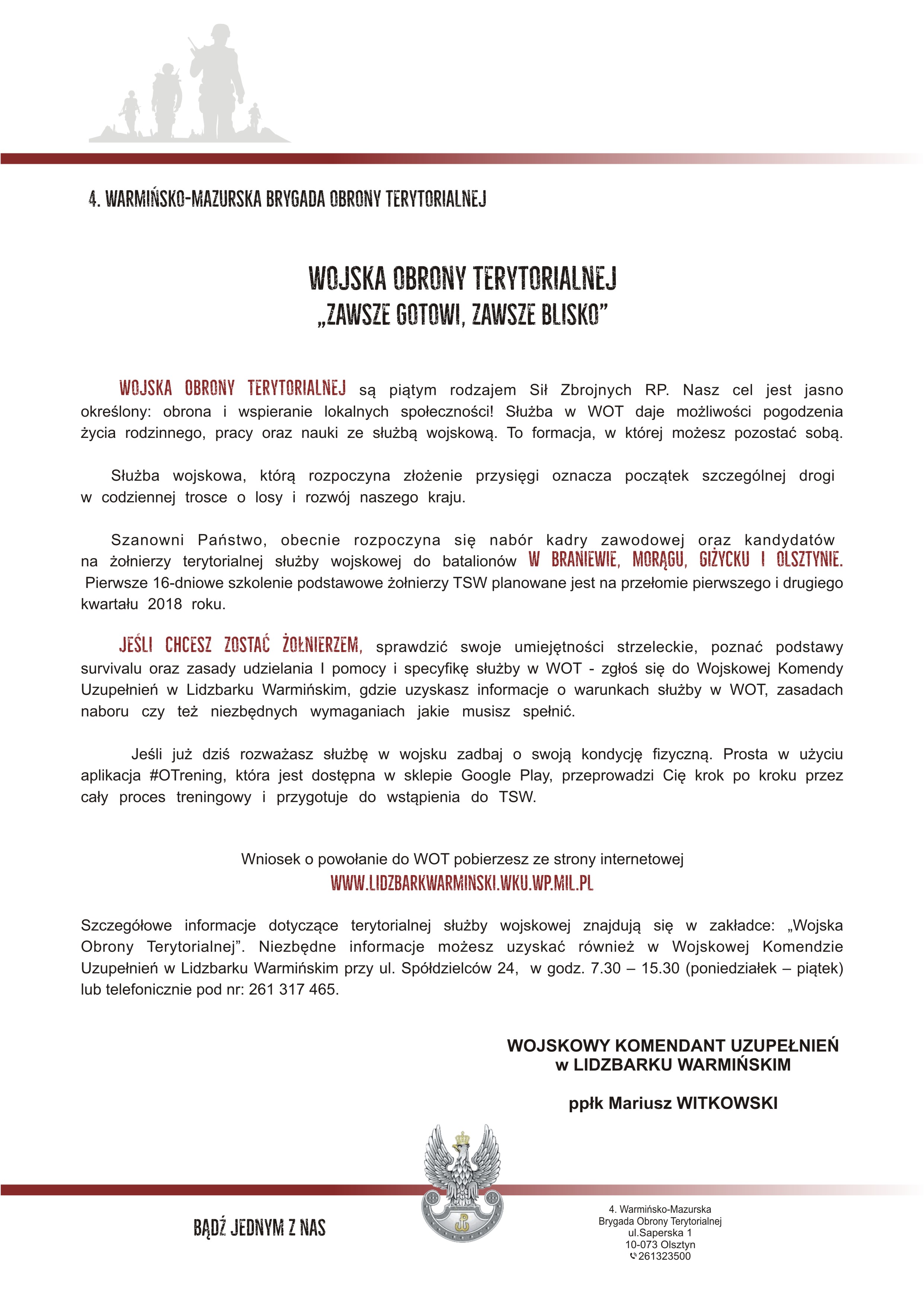 Wersja obowiązująca z dnia 06-12-2017 10:36:55 Drukuj Wojska obrony terytorialnej - terytorialna służba wojskowa 2 Do pobrania w załączeniu. Załączniki list nr 2 lidzbark format: image/jpeg, rozmiar: 936.38 KB, data dodania: 06-12-2017 10:36:55