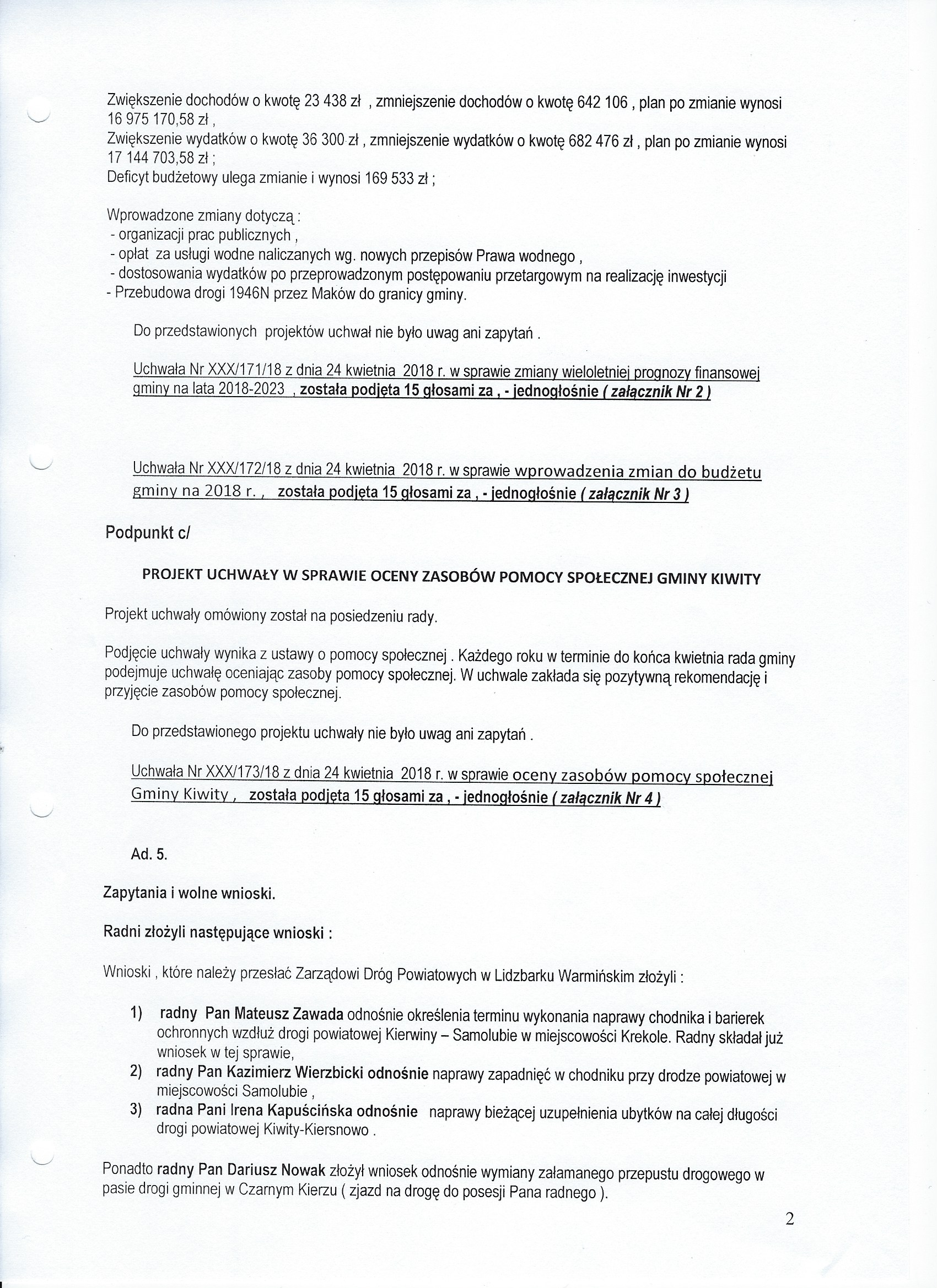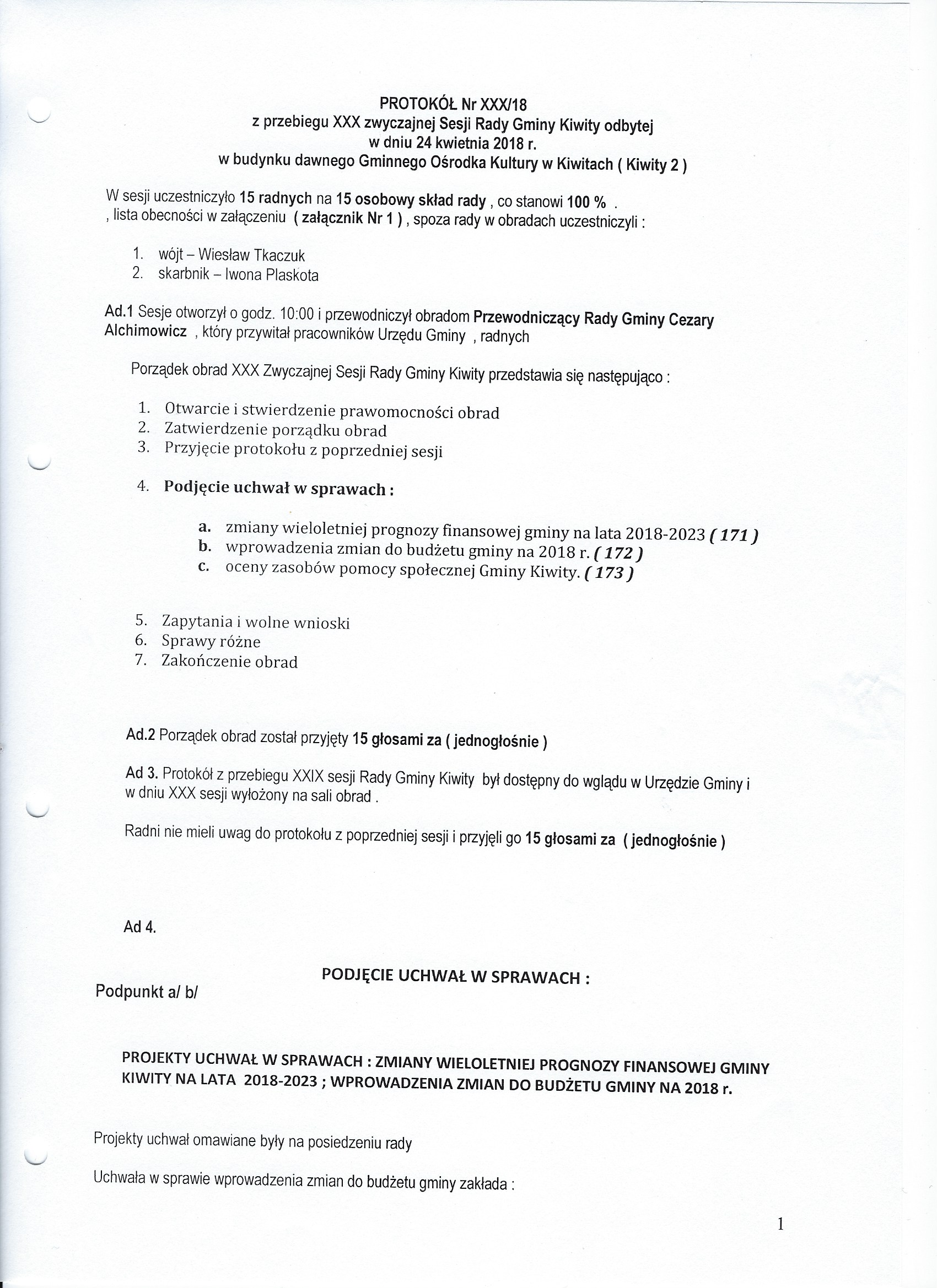 Protokół NR XXX/18 z przebiegu XXX zwyczajnej Sesji Rady Gminy Kiwity odbytej w dniu 24 kwietnia 2018 r.