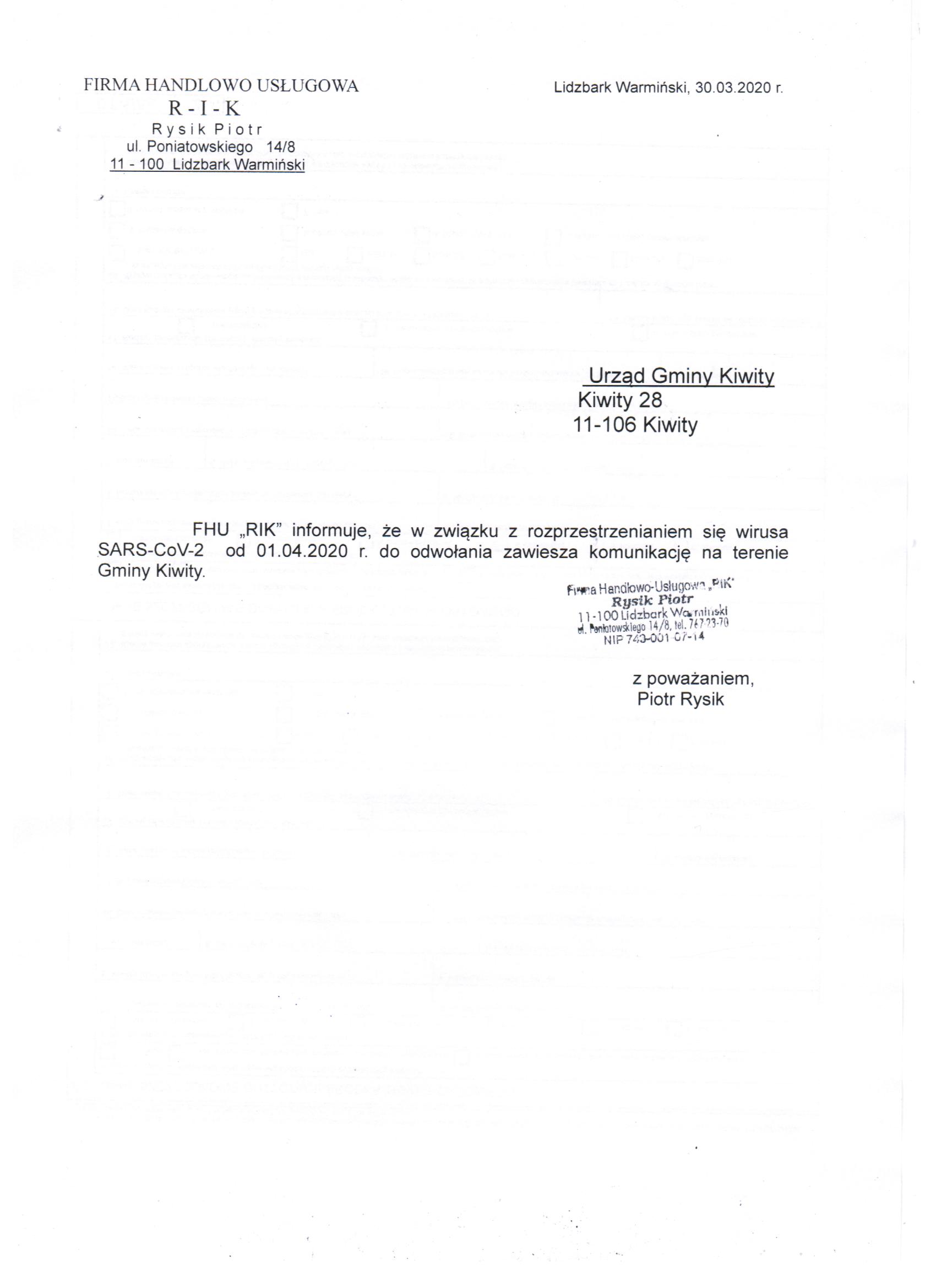 Wersja obowiązująca z dnia 30-03-2020 14:29:04 Drukuj Komunikat Firma Handlowo Usługowa RIK Komunikat Firma Handlowo Usługowa RIK Załączniki pismo 001 format: image/jpeg, rozmiar: 142.83 KB, data dodania: 30-03-2020 14:28:39