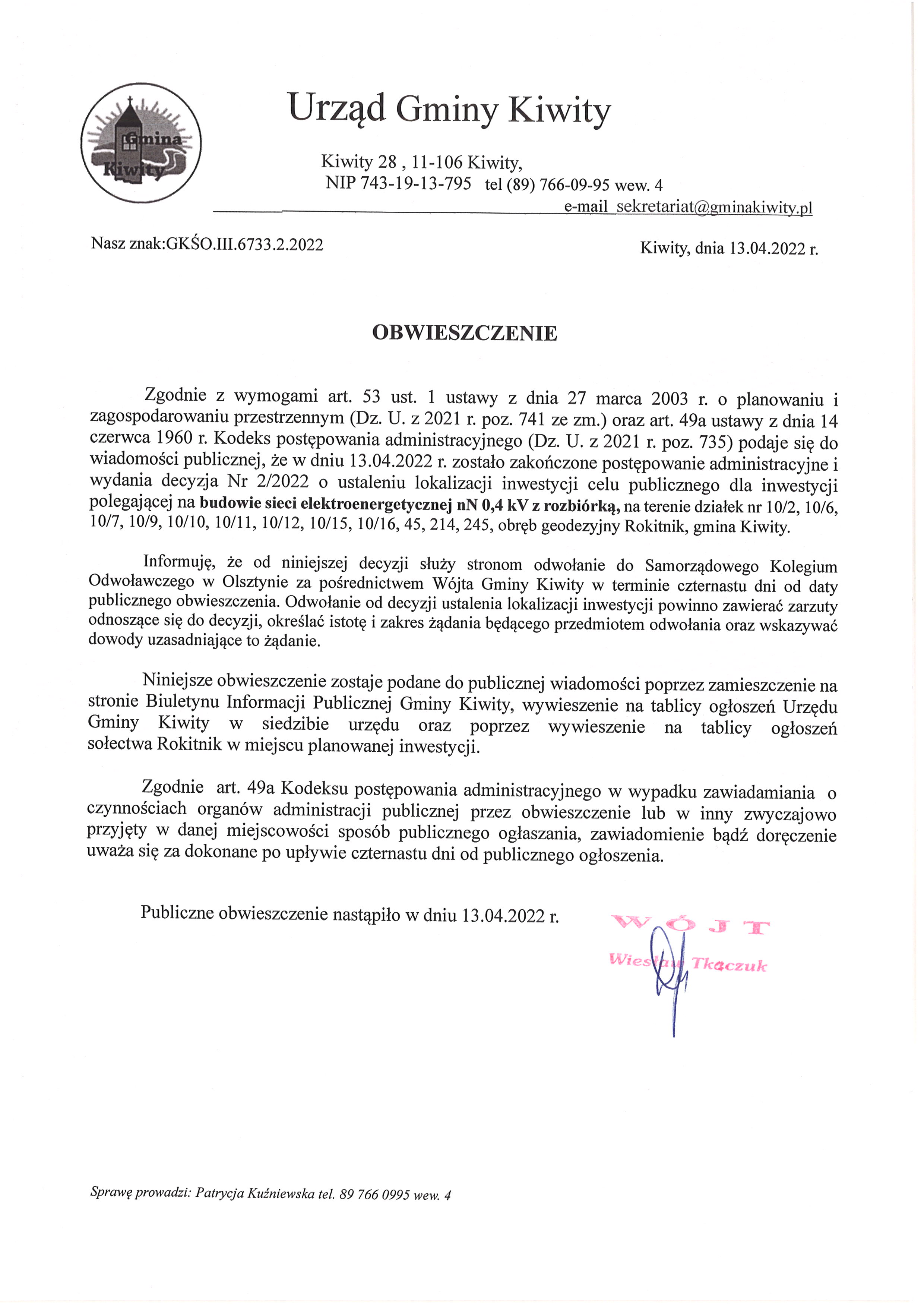 Obwieszczenie o zakończeniu postępowania administracyjnego i wydaniu decyzji o ustaleniu lokalizacji inwestycji celu publicznego – budowa elektroenergetycznej sieci kablowej nn 0,4kV w obrębie Rokitnik