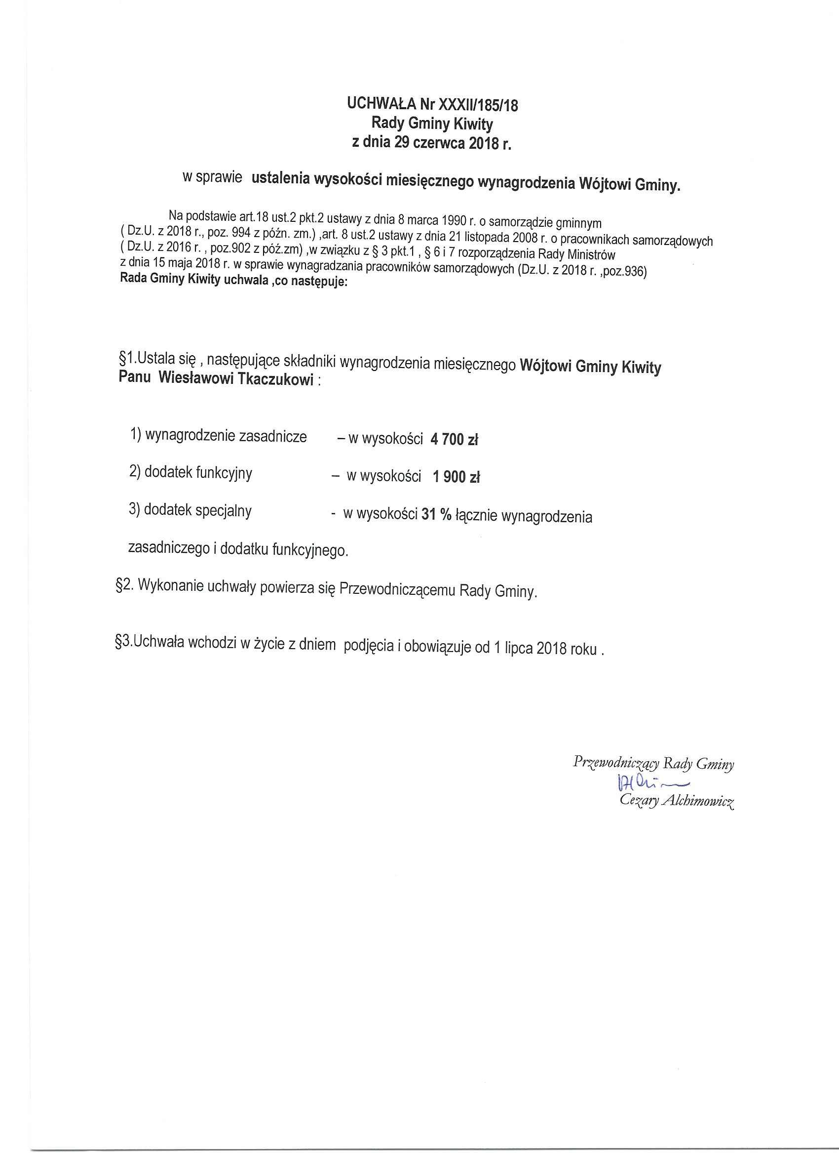 Uchwała w sprawie ustalenia miesięcznego wynagrodzenia Wójta