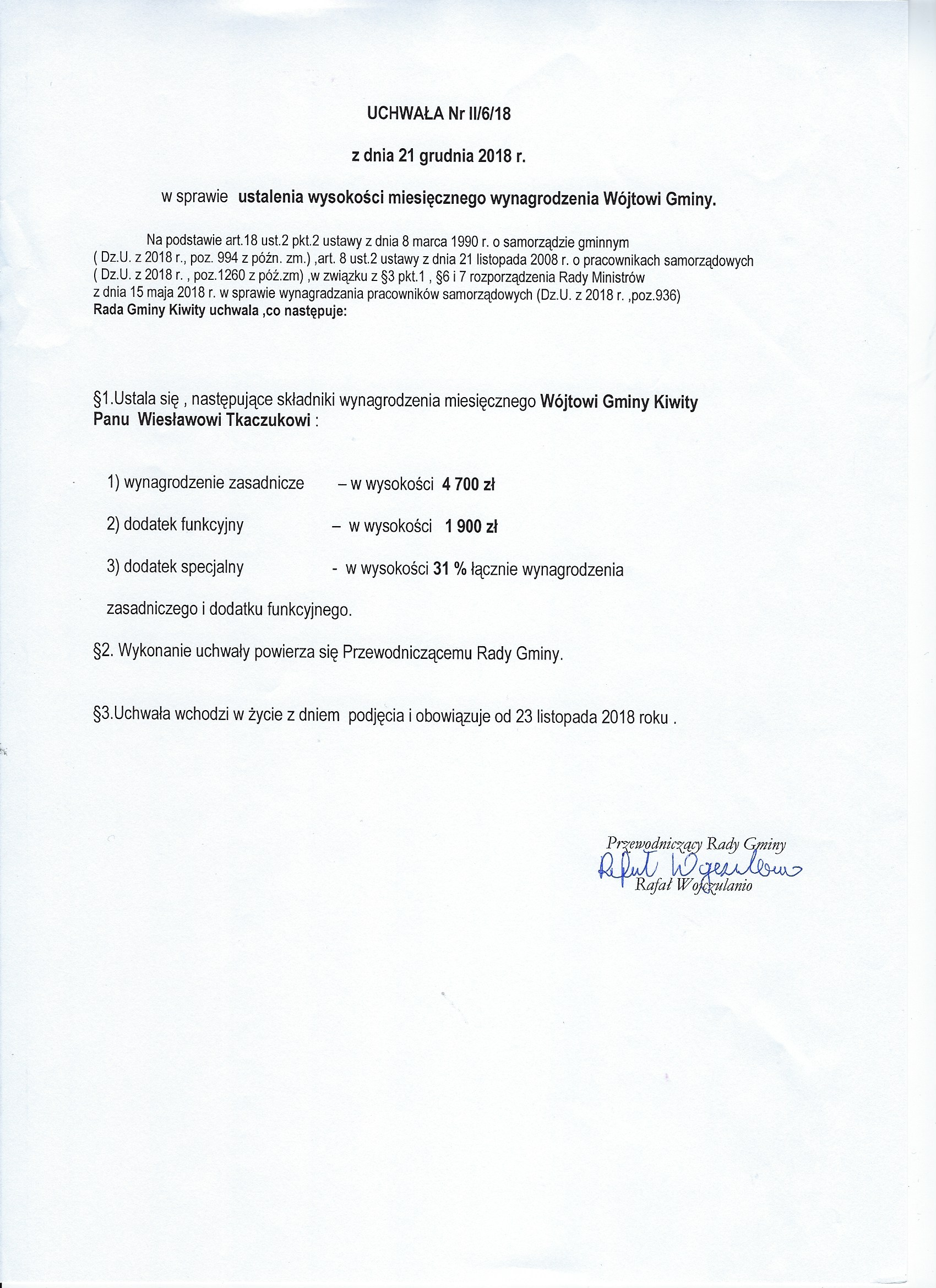 Uchwała w sprawie miesięcznego wynagrodzenia Wójta Gminy Kiwity