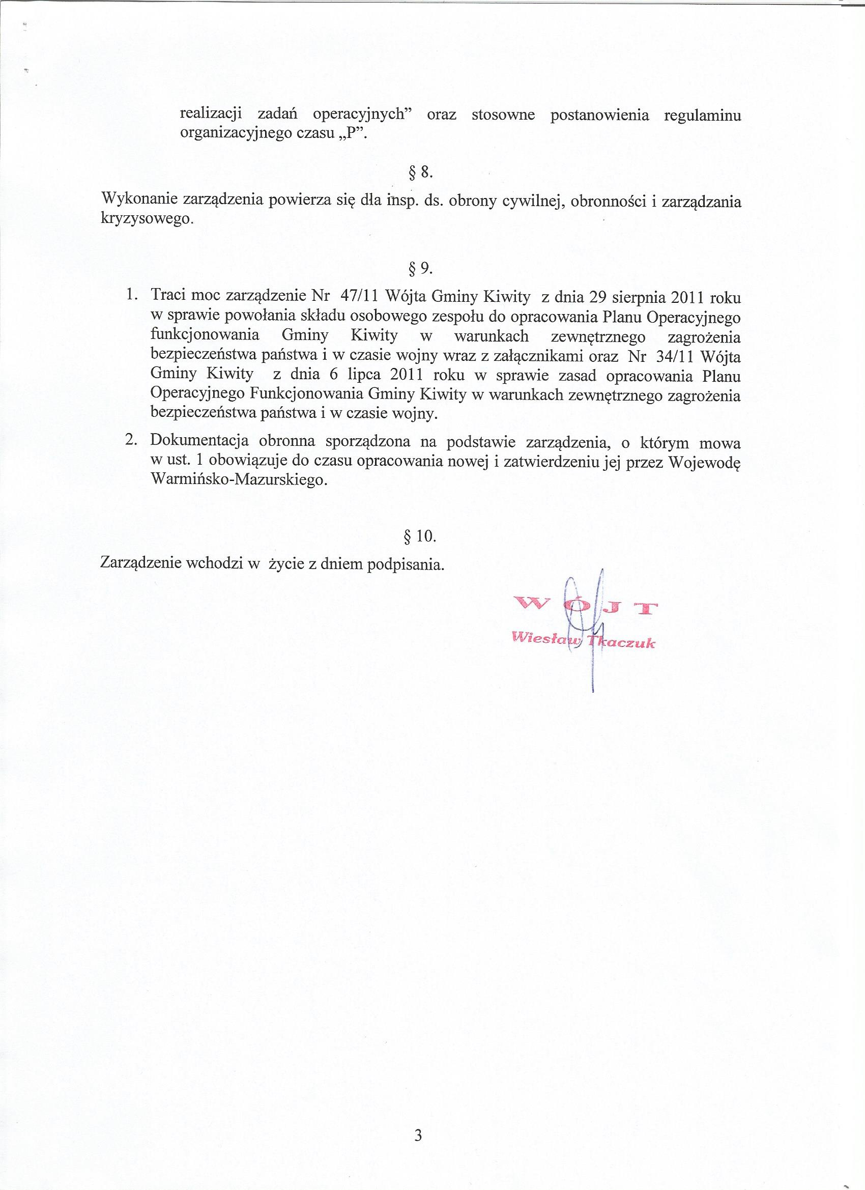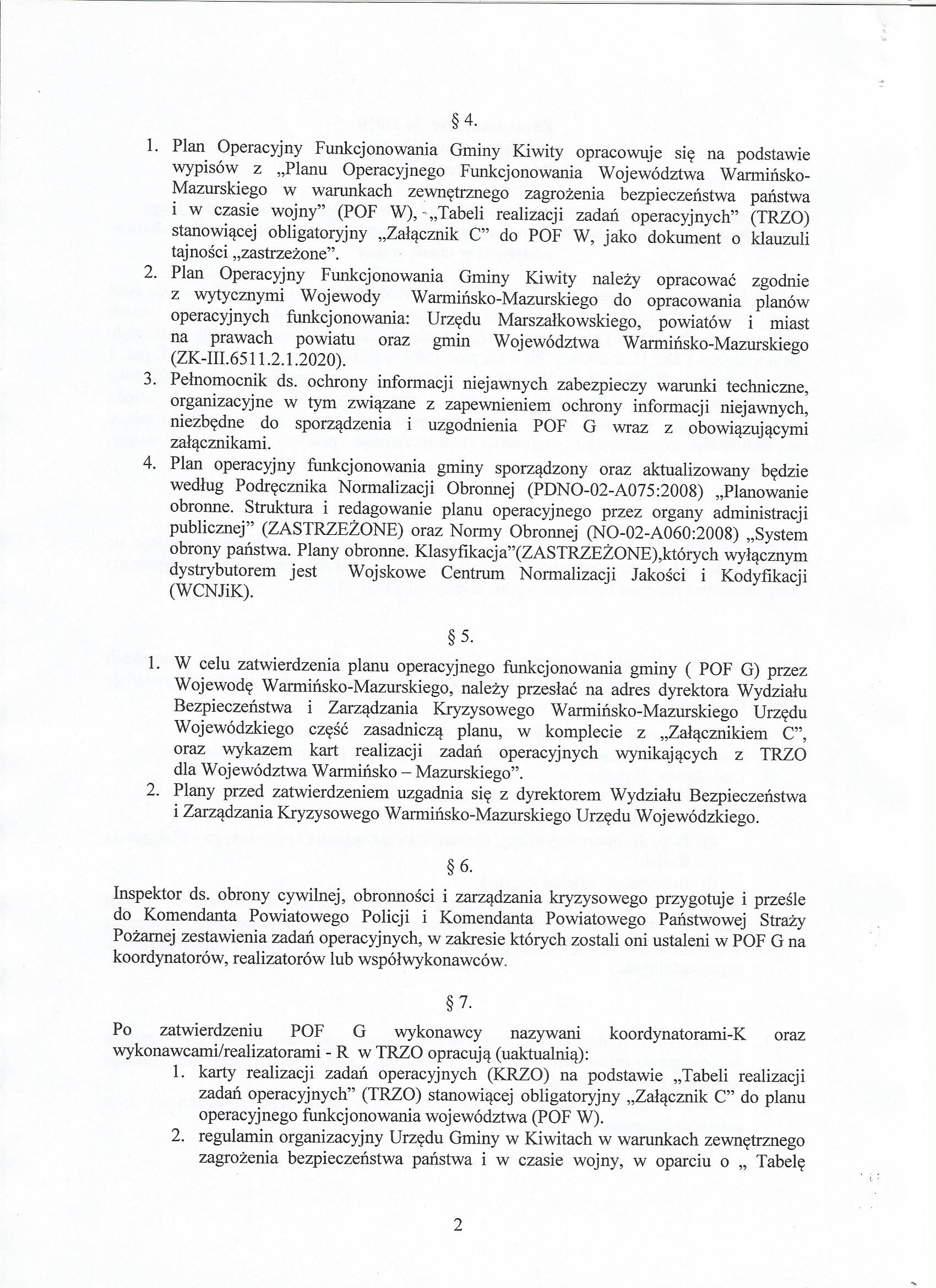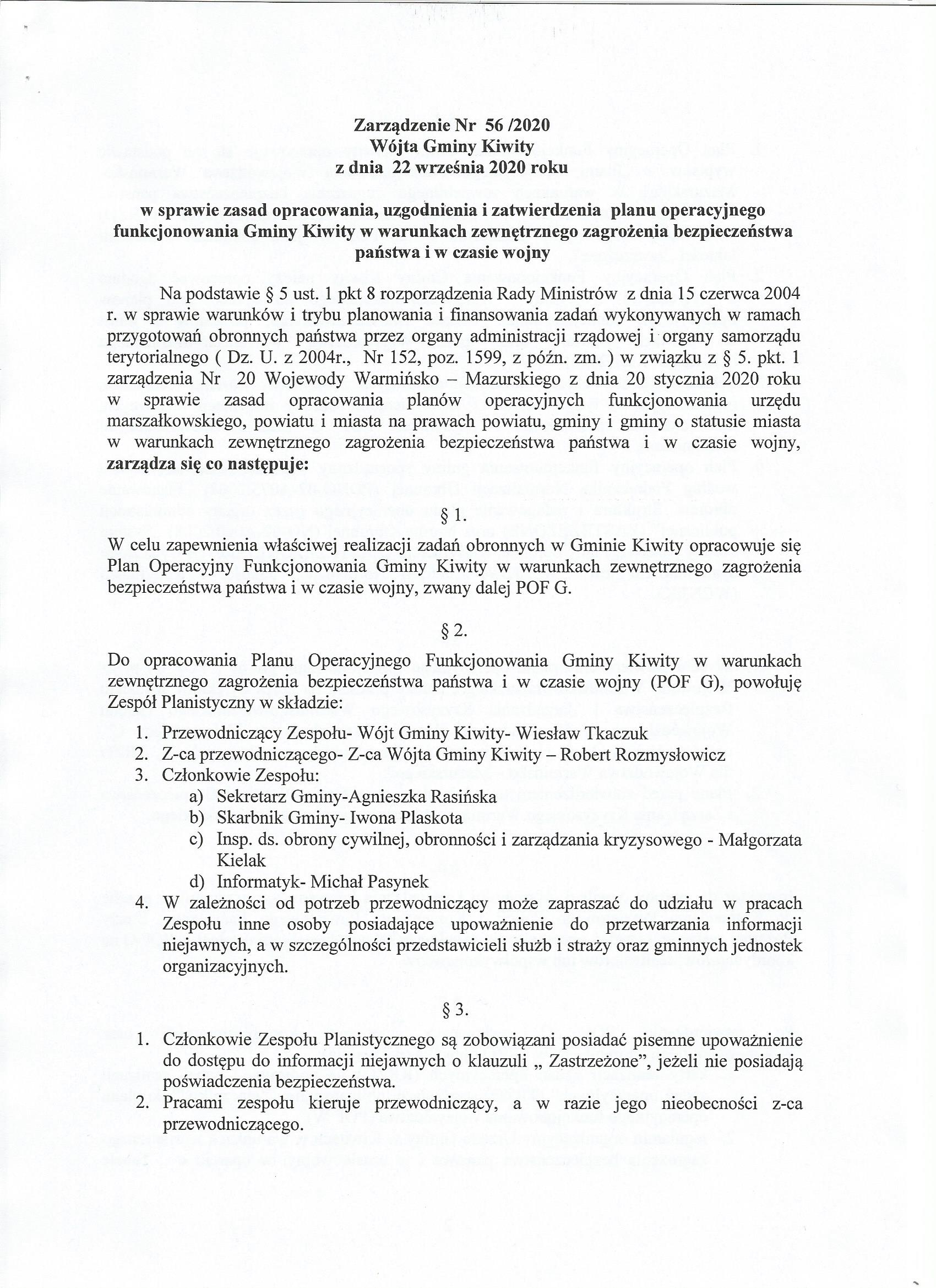 Zarządzenie w sprawie zasad opracowania, uzgodnienia i zatwierdzenia planu operacyjnego funkcjonowania Gminy Kiwity w warunkach zewnętrznego zagrożenia bezpieczeństwa państwa i w czasie wojny