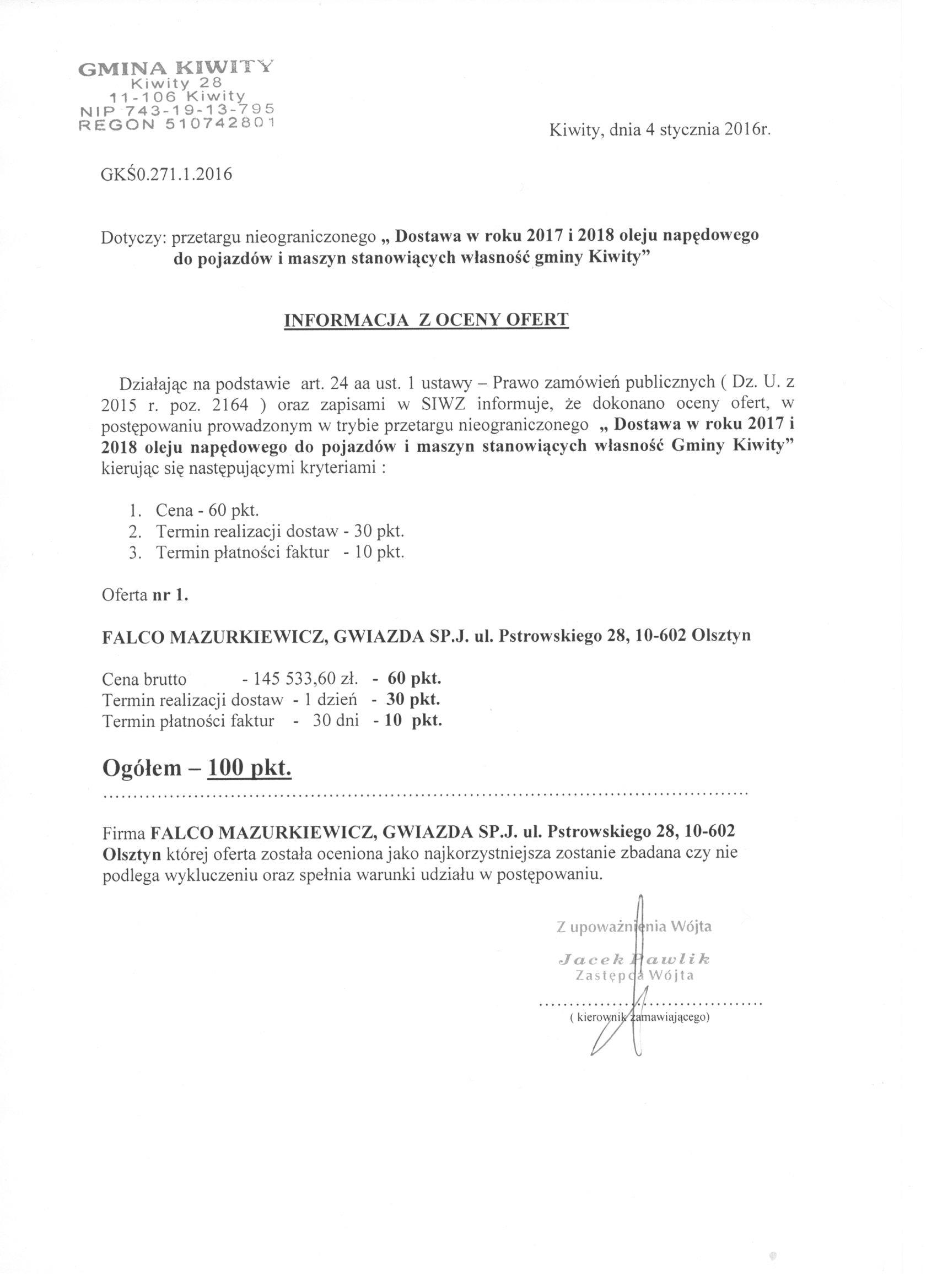„Dostawa w roku 2017 i 2018 oleju napędowego do pojazdów i maszyn stanowiących własność gminy Kiwity”.