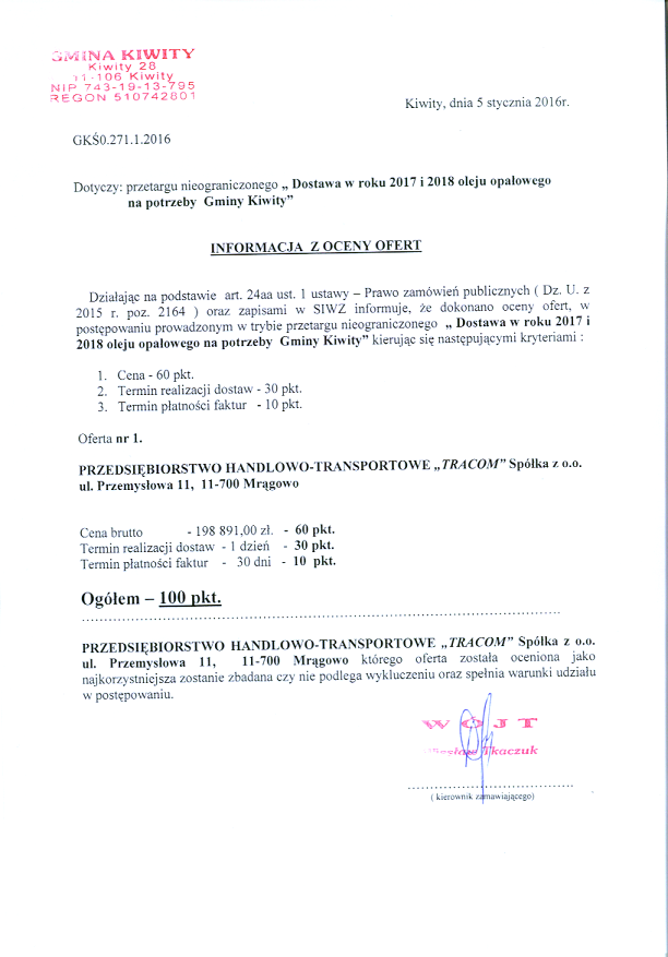 Ogłoszenie o wszczęciu postępowania dotyczącego projektu: „Dostawa w roku 2017 i 2018 oleju opałowego na potrzeby gminy Kiwity”